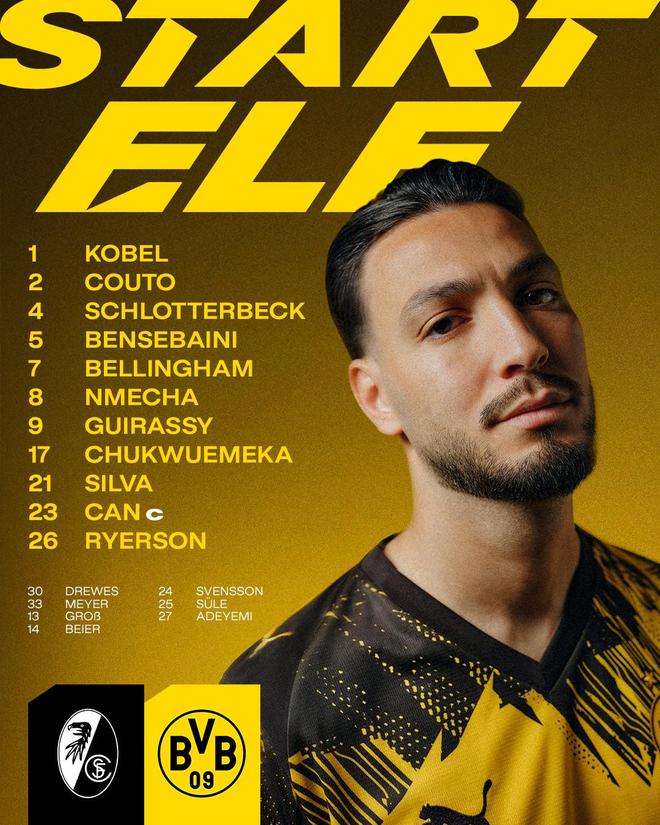 多特蒙德首发:1-科贝尔、2-扬-科托、4-施洛特贝克、5-本塞拜尼、7-乔布-贝林厄姆、8-恩梅加、9-吉拉西、17-丘库埃梅卡、21-法比奥-席尔瓦、23-埃姆雷-詹、26-瑞尔森