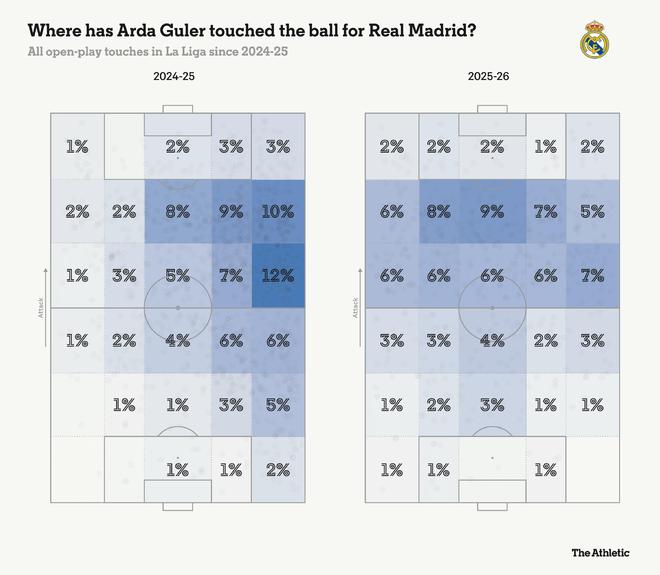 居莱尔的境遇转变,从出场时间上就能清晰体现。阿隆索在执教勒沃库森时,就曾希望签下当时效力于费内巴切的这位土耳其新星;如今在阿隆索麾下,居莱尔是皇马队内出场次数第六多的球员,而在安切洛蒂执教的最后一个赛季,他仅排在第17位。