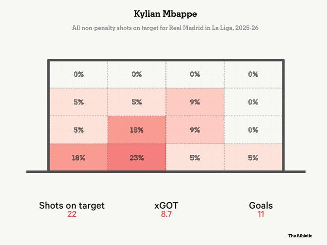 他的表现非常出色;打入16球并助攻2次,平均每63.38分钟比赛时间就参与一个进球。他在2025-26赛季至今的每次射门预期进球值为0.183,高于上赛季的0.164,也高于他在前俱乐部巴黎圣日耳曼最后三个赛季的数据(2021-22至2023-24赛季分别为0.162、0.180和0.180),这也表明他能在更好的位置完成射门。